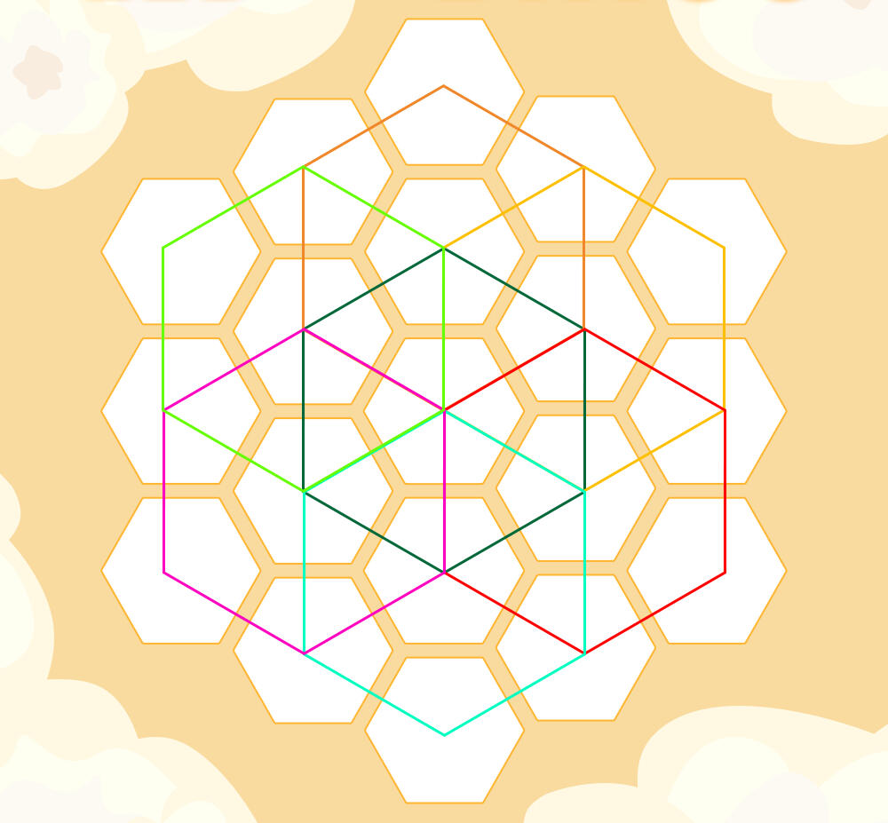 We're using a unique bingo format built out of hexagons (hex bingo). To get bingo in this format, you must make a hexagon shape out of the tiles on your card: